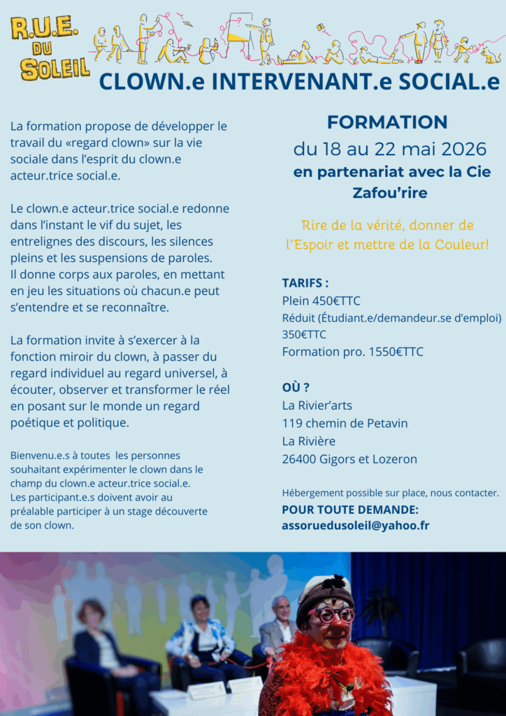 La formation propose de développer le travail du «regard clown» sur la vie sociale dans l’esprit du clown.e acteur.trice social.e.
