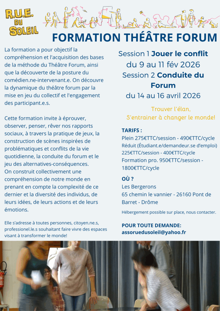 Cette formation invite à éprouver, observer, penser, rêver nos rapports sociaux, à travers la pratique de jeux, la construction de scènes inspirées de problématiques et conflits de la vie quotidienne, la conduite de forum et le jeu des alternatives-conséquences.