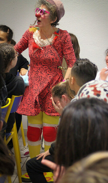 Nous intervenons avec le conte et le clown dans les établissements scolaires pour aborder et mettre en débat des situations qui posent problème : la discrimination, le harcèlement, les rapports filles/garçons, la place de l’individu dans le collectif et l’orientation professionnelle.